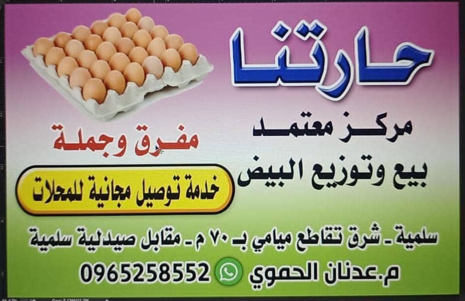 من نحن محل " حارتنا " لبيع وتوزيع البيض الطازج بالمفرق والجملة وأيضا بضائع أخرىبإدارة المهندس المتقاعد عدنان الحموي تقديم أفضل الخدمات للزبائن بأقل الأسعار نحاول دائما تقديم الأفضل خبراتنا نحن في البداية ونسعى للأفضل لنا ولكم نرغب بالاستماع لطلباتكم ورغباتكم وشكاويكم مبادئنا الأمانة والصدق إمكانية الترجيع حسب نوع البضاعة وزمن شرائها وسعرها التأكد من سلامة وصلاحية البضاعة اختيار البضاعة الجيدة في السوق الصفحة الرئيسية